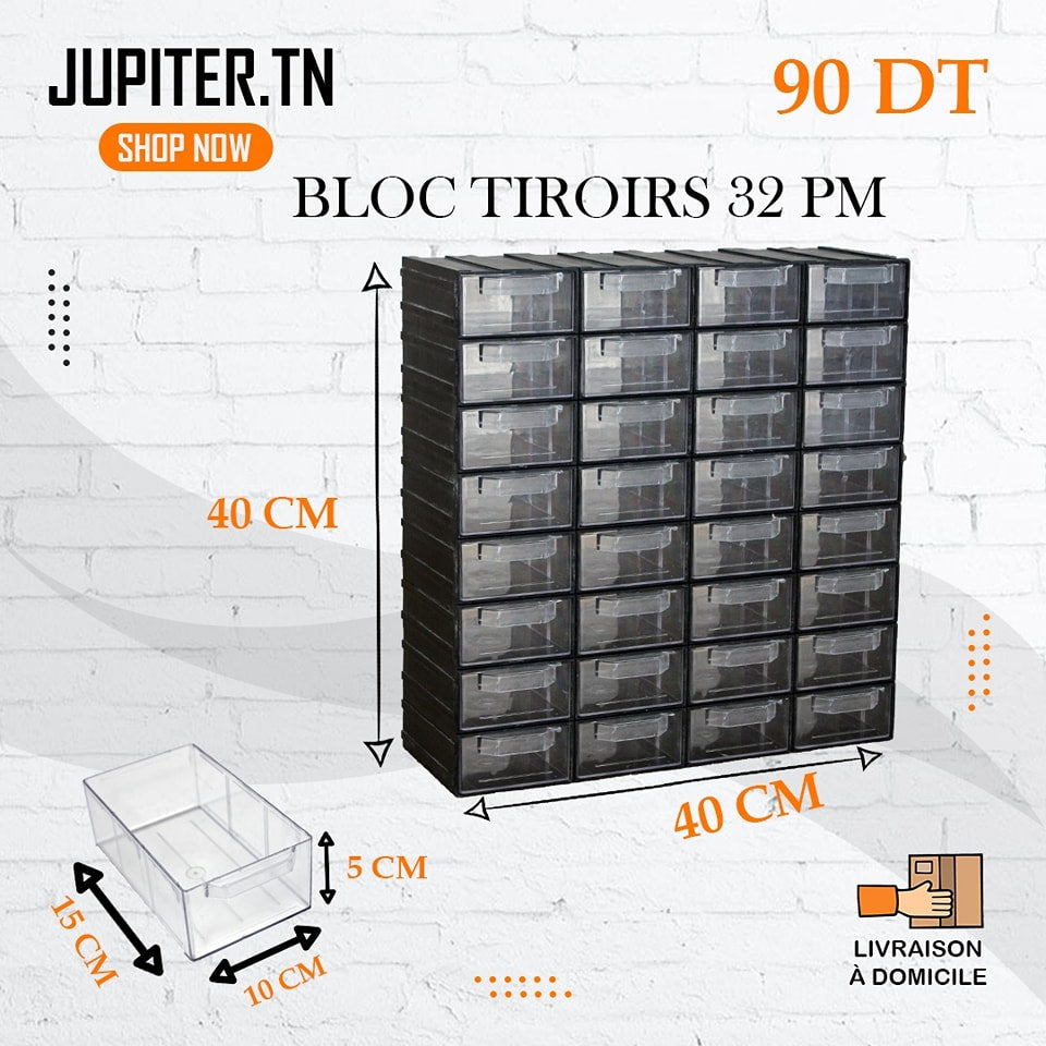 dimensions standardisées. Conçu pour les ateliers, les espaces de travail et les environnements industriels, ce bloc offre une solution de stockage efficace et modulable. Chaque tiroir est accessible individuellement, permettant un classement logique des pièces, outils ou matériaux. La construction robuste garantit une durabilité à long terme, tandis que la configuration compacte optimise l'utilisation de l'espace. Idéal pour améliorer la productivité en centralisant vos fournitures et composants à portée de main.